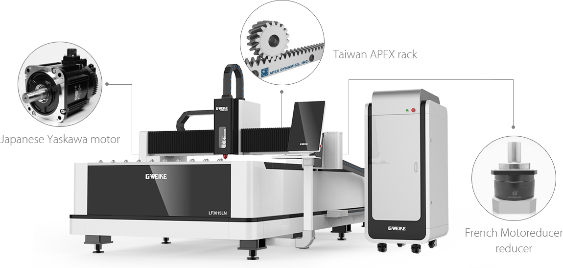 G.WEIKE fiber laser cutting machine is equipped with Japanese Yaskawa motor, French Motoreducer and Taiwan APEX rack. The positioning accuracy of the machine tool can be 0.02mm and the cutting acceleration is 1G. The working life is up to 10 years.